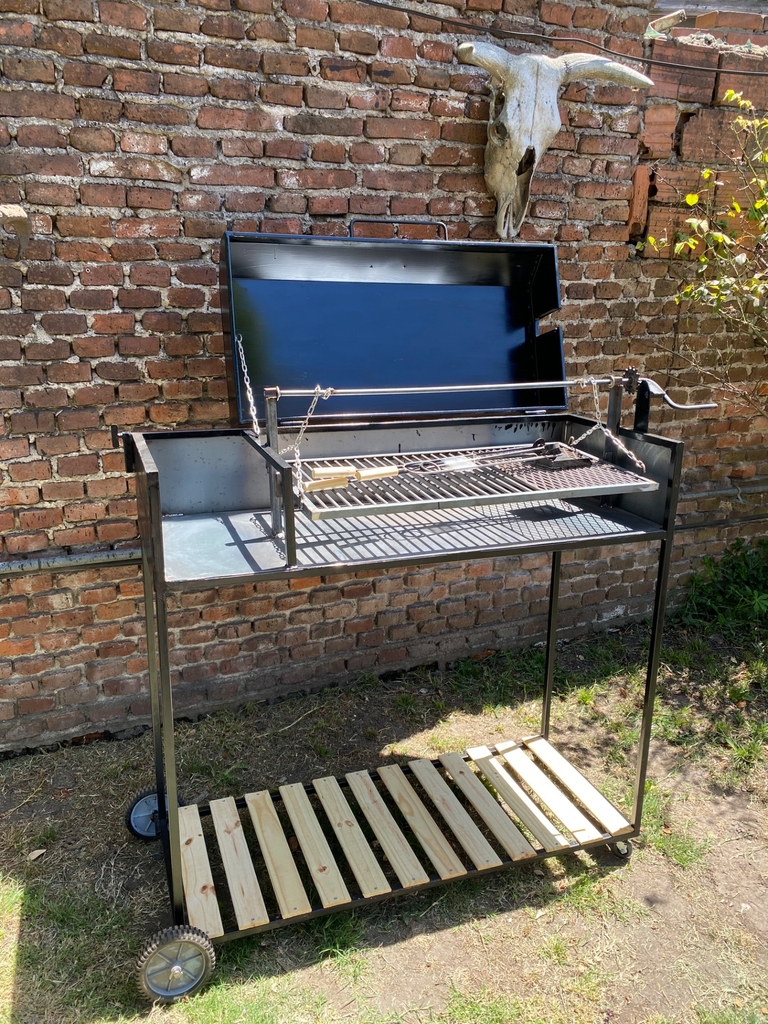 Fabricada en chapa de 3.2mm pintada de negra, cuenta con cuatro ruedas dos fijas y dos giratorias, estante en la parte inferior, sistema para la parrilla para regular la altura.